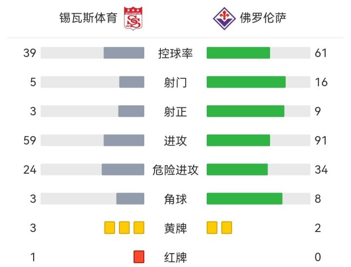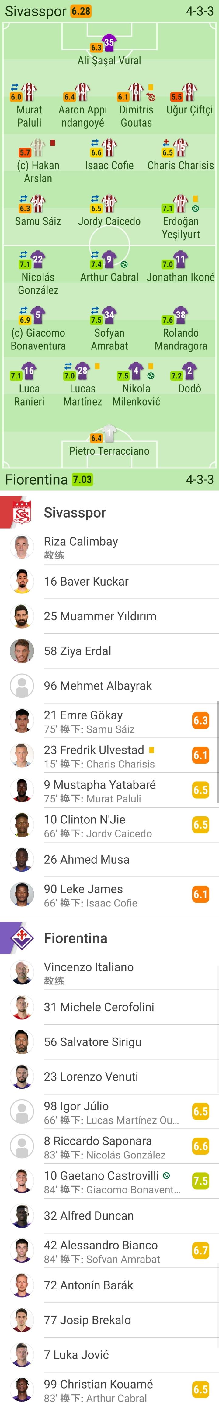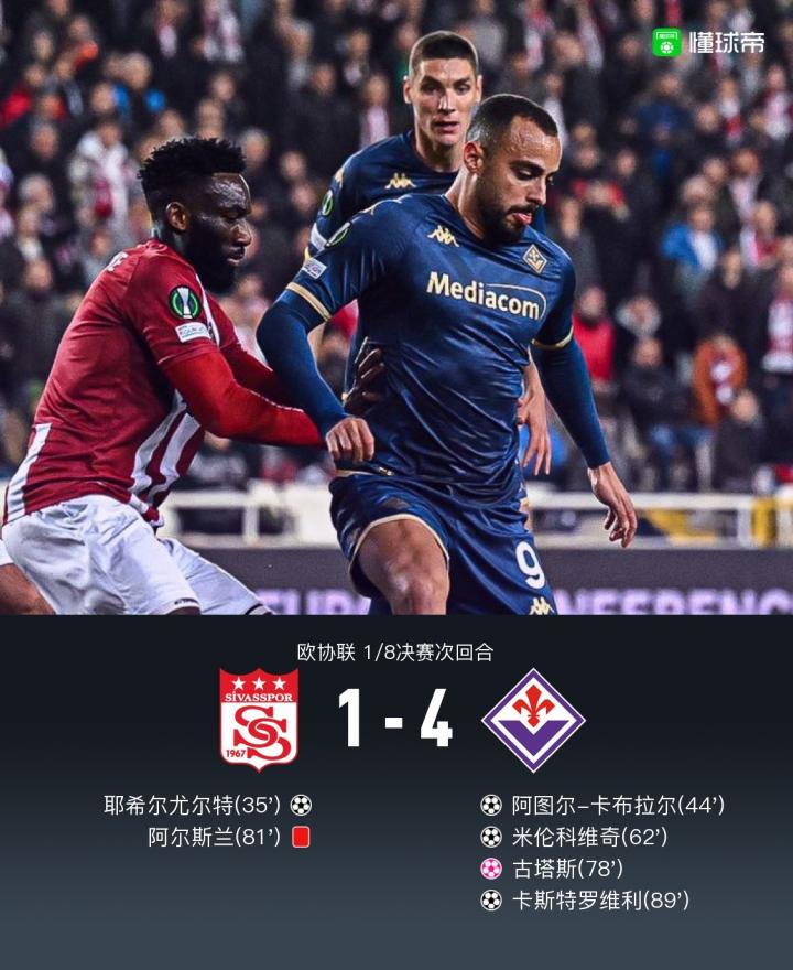 北京时间3月17日01:45,欧协联1/8决赛次回合,佛罗伦萨作客新锡瓦斯体育场挑战土耳其球队锡瓦斯体育,本场主裁判为达巴诺维奇,首回合佛罗伦萨主场1-0取胜。上半场,耶希尔尤尔特世界波破门,阿图尔-卡布拉尔补射扳平。下半场,米伦科维奇头槌建功,古塔斯自摆乌龙,卡斯特罗维利兜射世界波直挂死角,阿尔斯兰被直红罚下。最终,佛罗伦萨客场4-1击败锡瓦斯体育,总比分5-1晋级欧协联8强。