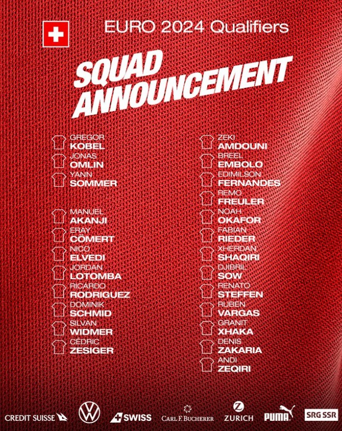 扫描下载懂球帝首页>动态> 瑞士队最新一期大名单:扎卡、沙奇里、索默、阿坎吉入选