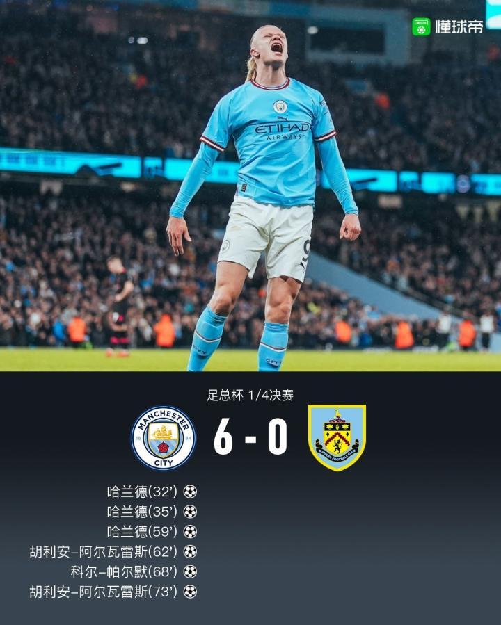 北京时间3月19日01:45,足总杯1/4决赛展开争夺,曼城坐镇主场阿提哈德球场迎战英冠球队伯恩利,本场主裁判为约翰-布鲁克斯。上半场,哈兰德三分钟内先后接胡利安-阿尔瓦雷斯和福登的助攻破门上演梅开二度。下半场,哈兰德再下一城上演帽子戏法,德布劳内两度助攻胡利安-阿尔瓦雷斯破门完成双响,科尔-帕尔默替补建功。最终,曼城主场6-0狂胜伯恩利,晋级足总杯4强。