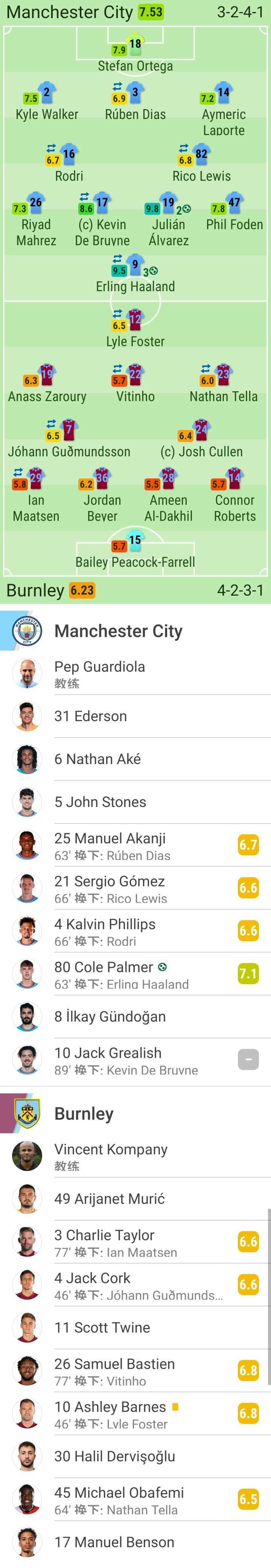 曼城首发:18-奥尔特加-莫雷诺、82-里科-刘易斯(66'21-塞尔希奥-戈麦斯)、14-拉波尔特、3-鲁本-迪亚斯(63'25-阿坎吉)、2-凯尔-沃克、16-罗德里-埃尔南德斯(66'4-卡尔温-菲利普斯)、17-德布劳内(89'10-格拉利什)、26-马赫雷斯、47-福登、19-胡利安-阿尔瓦雷斯、9-哈兰德(63'80-科尔-帕尔默)