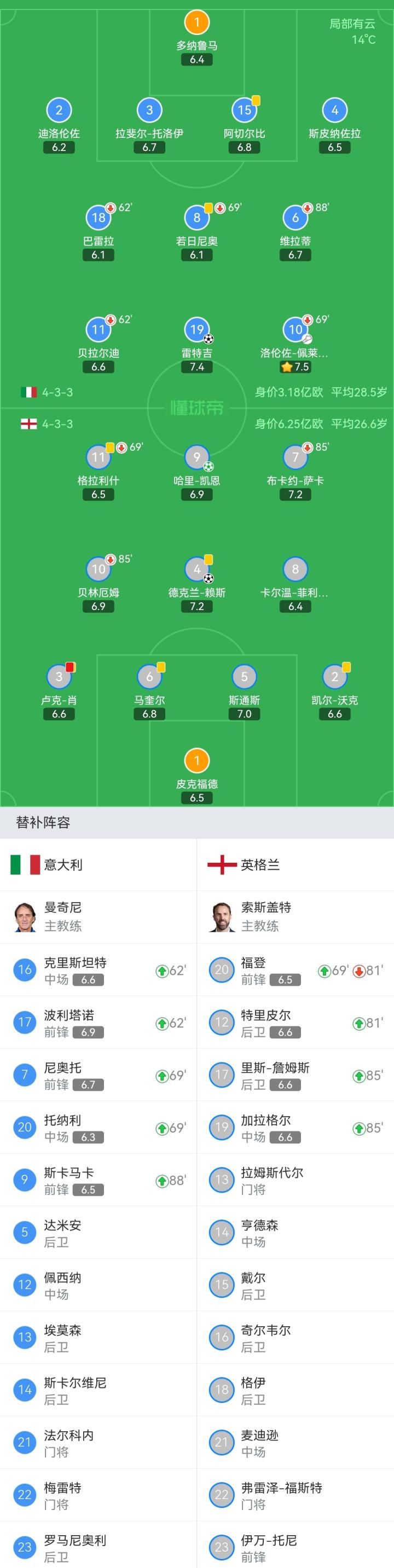 意大利首发:1-多纳鲁马、2-迪洛伦佐、3-拉斐尔-托洛伊、15-阿切尔比、4-斯皮纳佐拉、18-巴雷拉(62'16-克里斯坦特)、6-维拉蒂(88'9-斯卡马卡)、8-若日尼奥(69'20-托纳利)、10-洛伦佐-佩莱格里尼(69'7-尼奥托)、11-贝拉尔迪(62'17-波利塔诺)、19-雷特吉