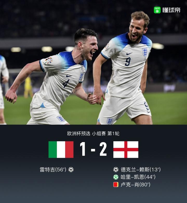 北京时间3月24日03:45,欧洲杯预选赛小组赛C组第1轮,意大利坐镇马拉多纳球场迎战英格兰,本场主裁判为约万诺维奇。上半场,赖斯首开记录,随后迪洛伦佐手球送点,凯恩操刀一蹴而就,以54球超越鲁尼,独享英格兰队史射手王;格拉利什失空门。下半场,雷特吉国家队首秀即破门,卢克-肖两分钟连吃两黄被罚下。最终,英格兰客场2-1力克意大利。
