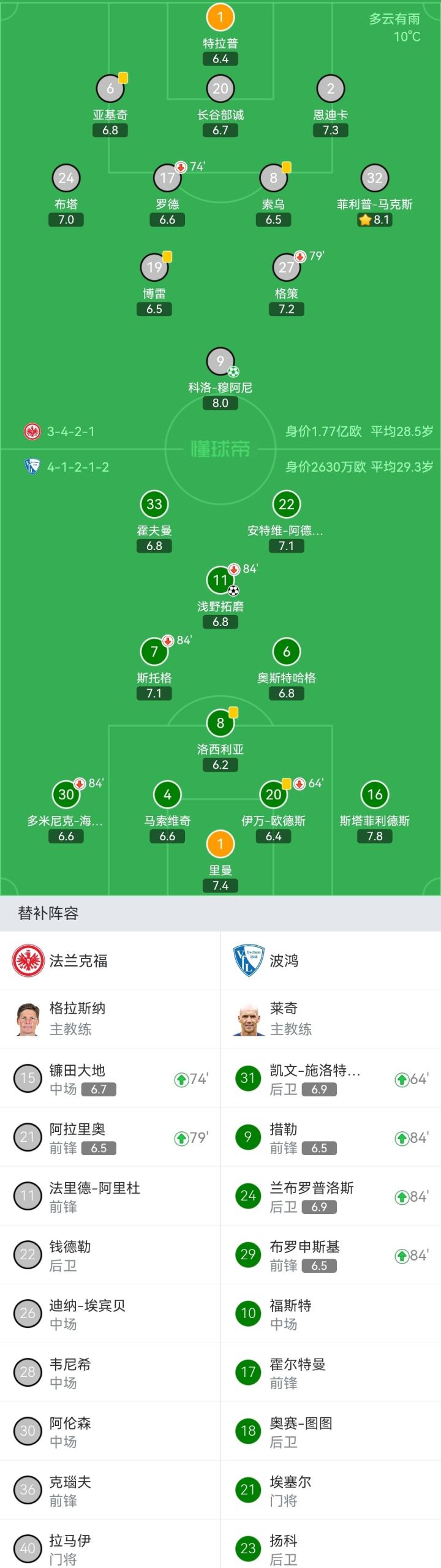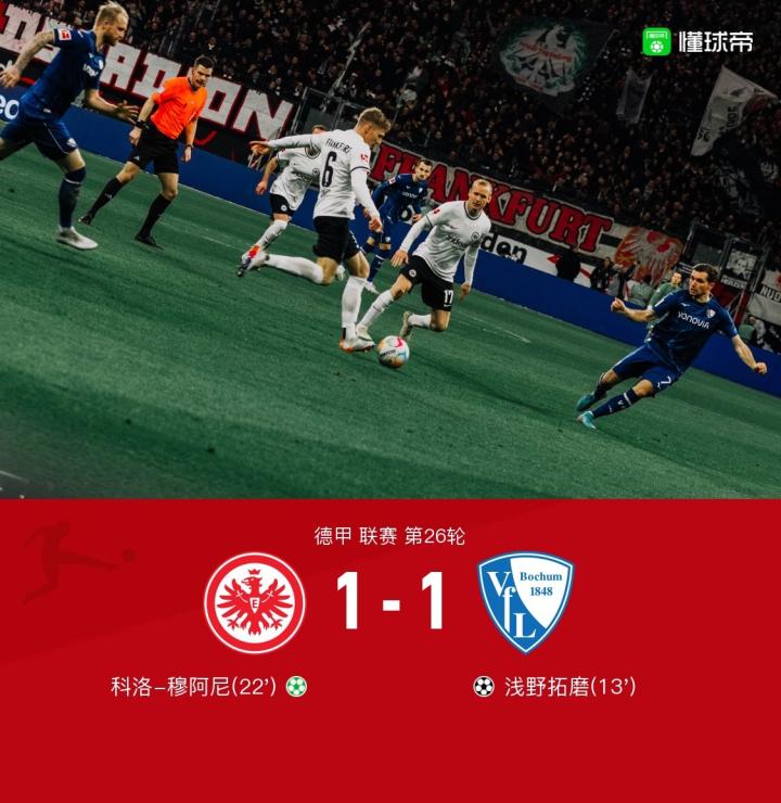 扫描下载懂球帝首页>动态> 法兰克福1-1波鸿遭联赛5轮不胜,浅野拓磨破门,穆阿尼点射