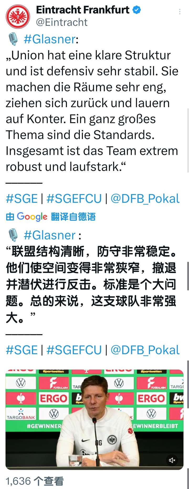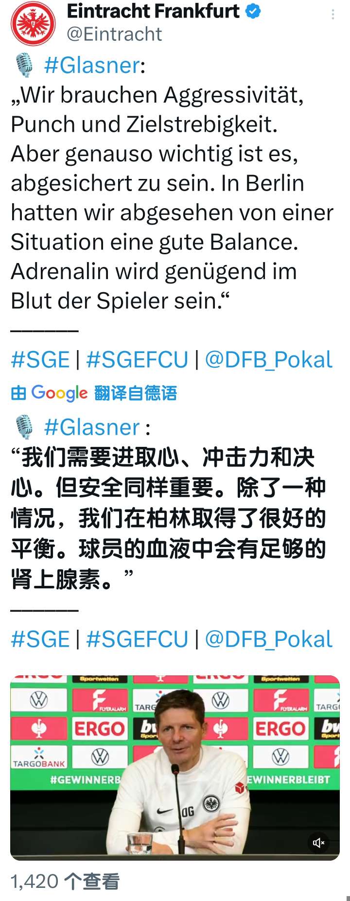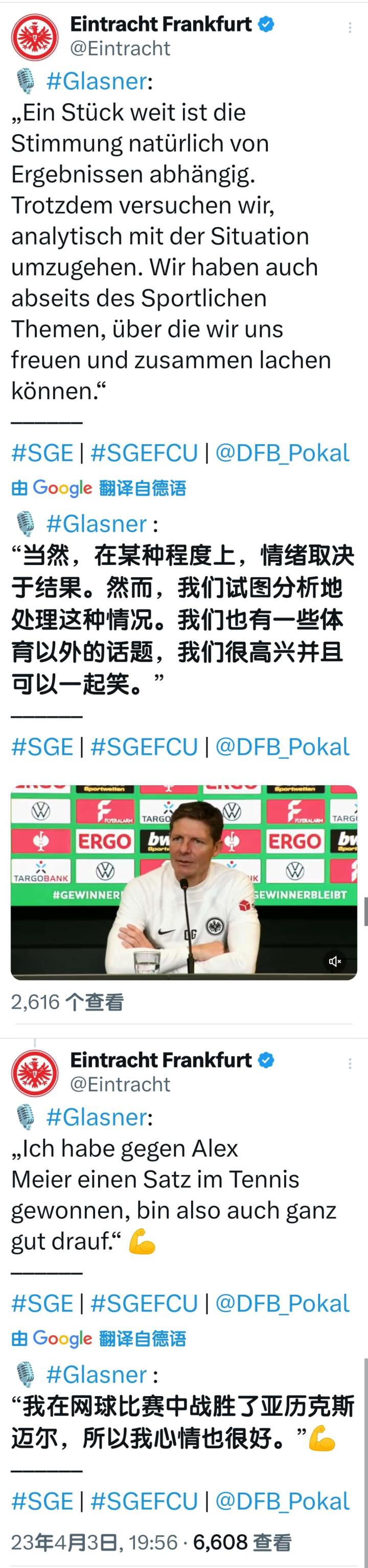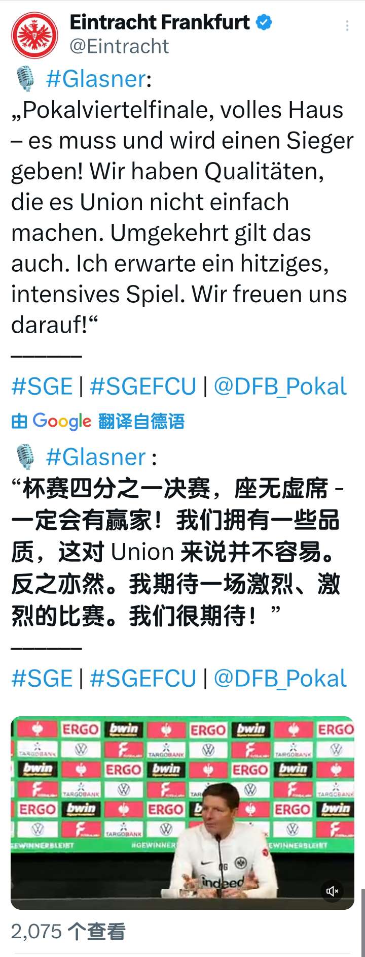 扫描下载懂球帝首页>动态> 懂球号> 德国杯1/4决赛 法兰克福vs柏林联合 赛前采访...