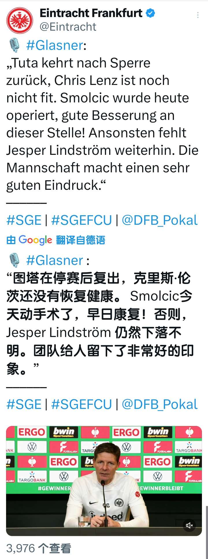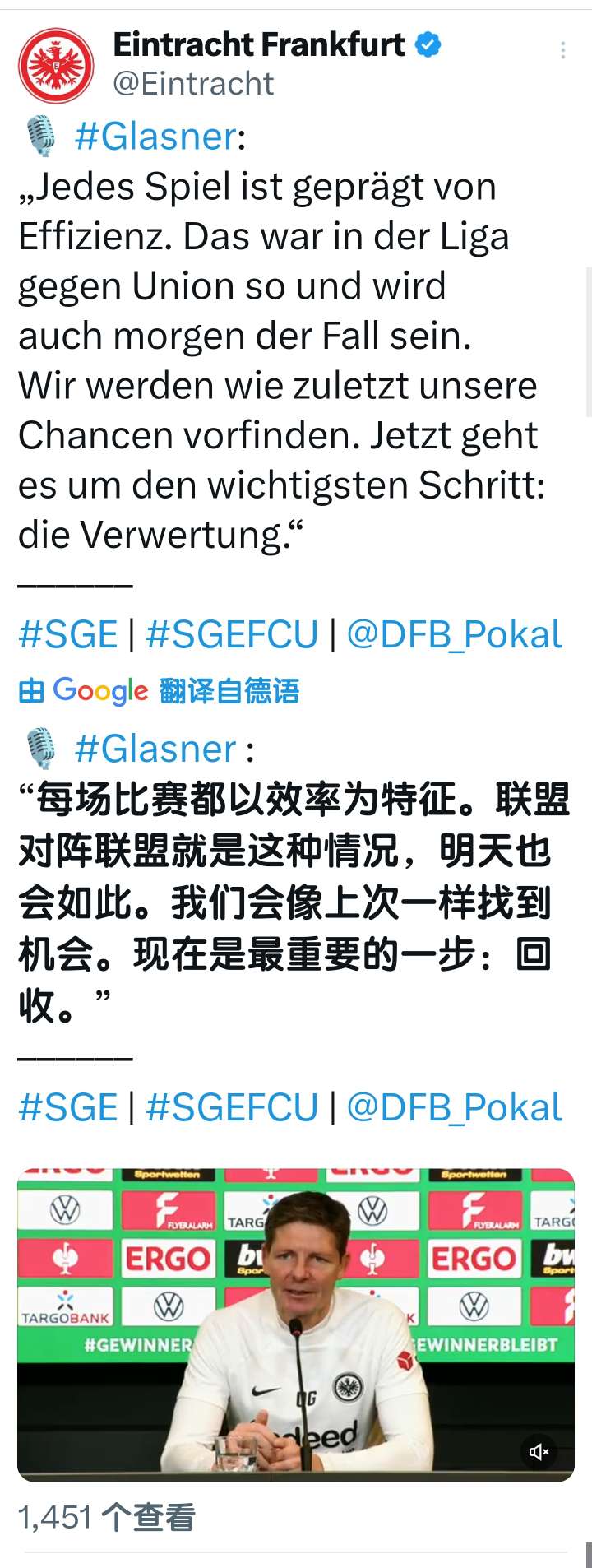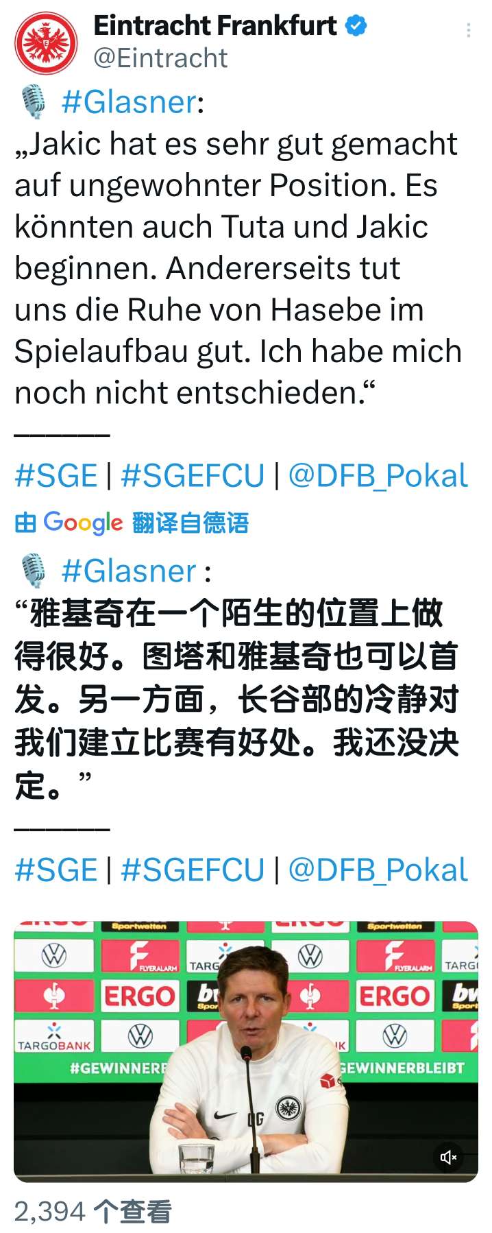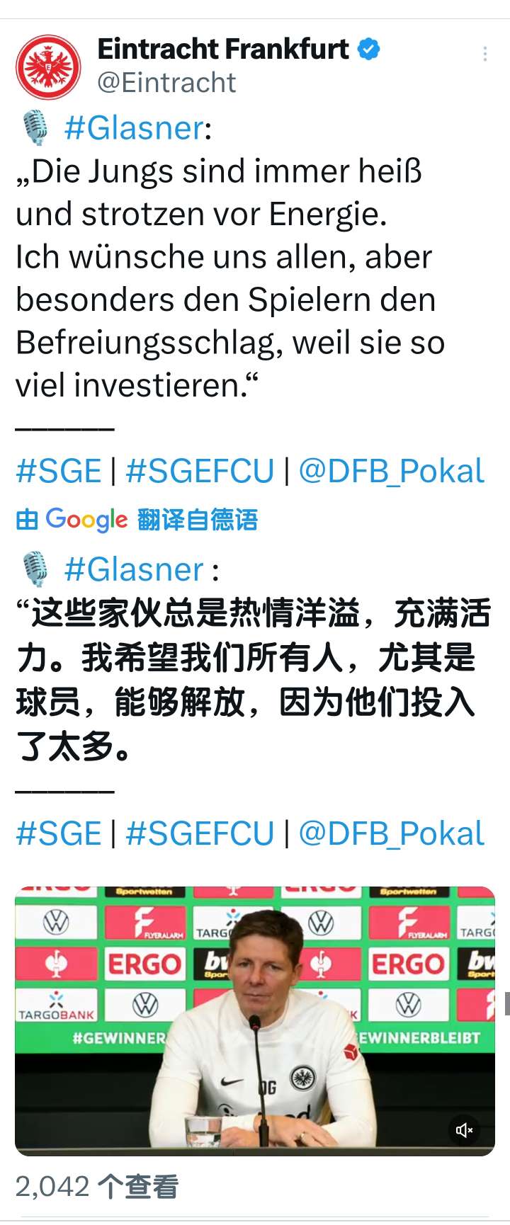 扫描下载懂球帝首页>动态> 懂球号> 德国杯1/4决赛 法兰克福vs柏林联合 赛前采访...