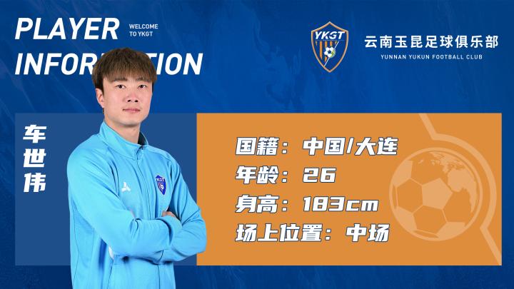 车世伟出道于大连青训,基本功扎实,拼抢积极,中场控球能力佳,是球队中场架构的重要补充。2016年完成个人中超首秀,2022年跟随昆山夺得中甲冠军,欢迎车世伟加入云南玉昆大家庭,和球队一起为新赛季目标全力以赴。