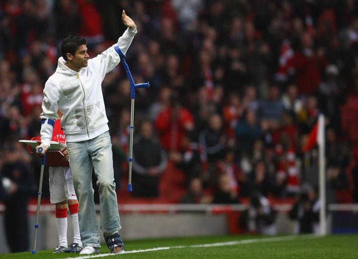 (图)爱德华多在遭遇重伤后的几周在场边向阿森纳球迷挥手致意