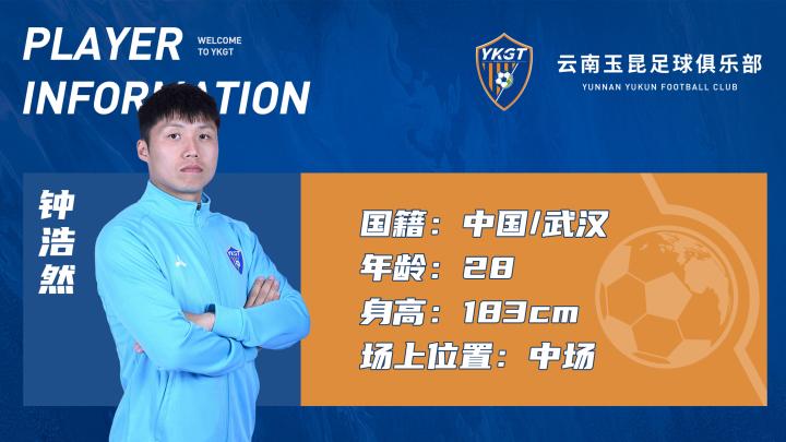 钟浩然,司职中场,出身于湖北省青训,曾效力于湖南湘涛、塞超苏博蒂察斯巴达克俱乐部。钟浩然曾是湖北队93届的全运会队长,也曾入选过国青队,并在2012年的中朝友谊赛中,凭借“一传一射”给中国球迷留下深刻印象。2018-2022赛季回国加盟浙江队,2021年跟随浙江队冲超成功,钟浩然脚法细腻,擅长组织与调度。