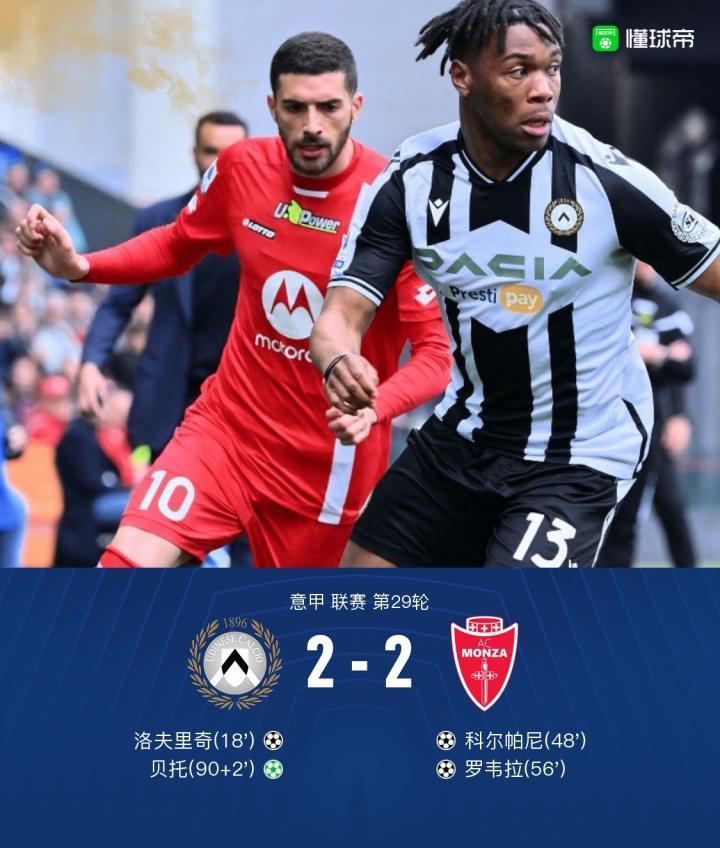 北京时间4月8日18:30,意甲第29轮继续进行,乌迪内斯坐镇主场达契亚竞技场迎战蒙扎,本场主裁判为马西米。上半场,华莱士-索萨精准直塞助攻洛夫里奇单刀破门。下半场,蒙扎凭借科尔帕尼和罗韦拉的进球实现逆转,贝托点射绝平。最终,乌迪内斯主场2-2战平蒙扎。