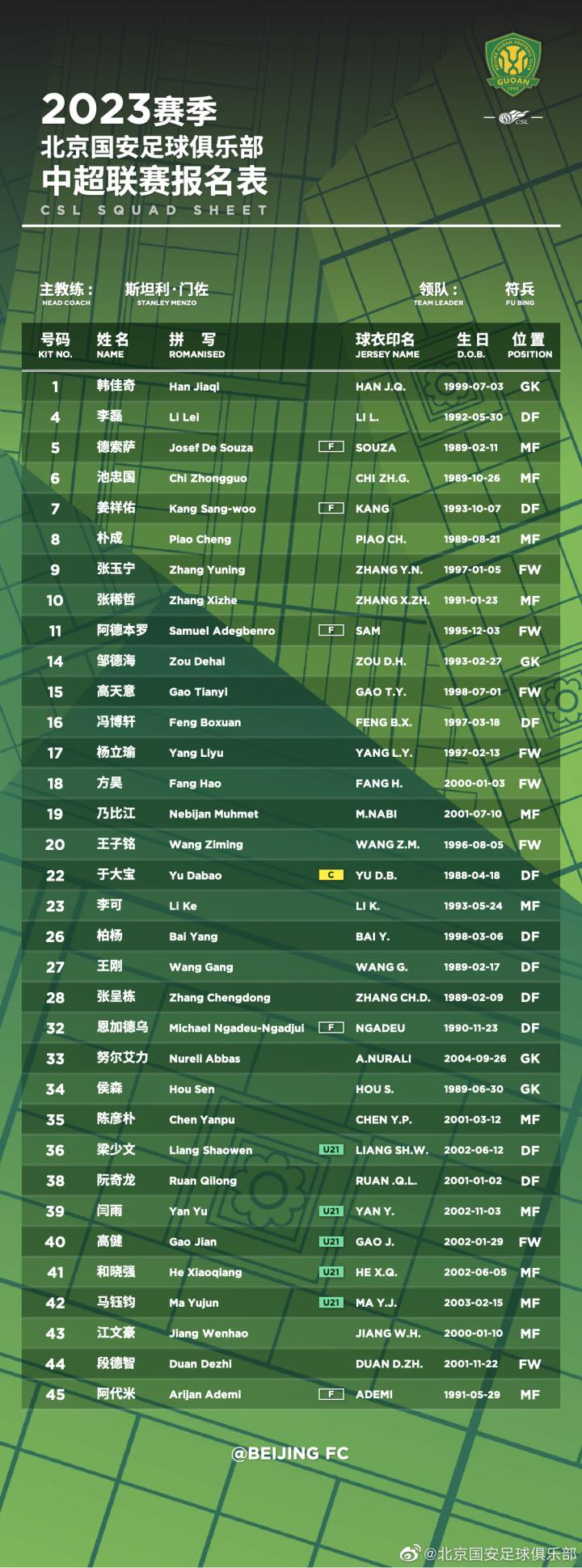 🆕北京国安2023一线队名单公布 💚为了北京,战斗!🦁🦁🦁