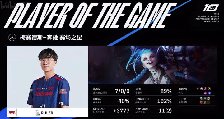 第36分钟,下路团战,双方打出2换2,随后JDG推上高地JDG金克丝三杀结束比赛,恭喜JDG赢下本场比赛,成功卫冕冠军成功。