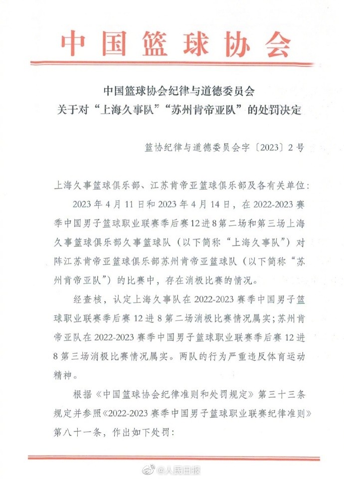 反正我是不服的,消极比赛没毛病,关键洗比赛的前奏是为什么洗?血布事件你篮协没问题?同样的动作人家一场血布四场?再说句不好听的话,人家罚10万,血布为什么罚14万?有因才有果,你说消极比赛,罚也就罚了,但是取消上海队比赛资格?为什么?这不是教练安排的人员吗?他不让外援上,外援敢上?几个小朋友都打的挺认真的,也在努力追分,第三场比赛也是,这些都是教练俱乐部安排的,但是球员们是想打球的,另外,春江5年?李楠3年?他们都不是消极比赛,为什么一个比另一个多近50%的处罚?如果说是假球,那更应该出示证明了,我觉得此事应该还有后续,当然,我也要骂上海队,作为上海球迷,真的很心凉,看了一个赛季了,也是挺不容易的,为什么最后结果是这样?哎,即使假,你也要学学nba啊,假的像真的一样