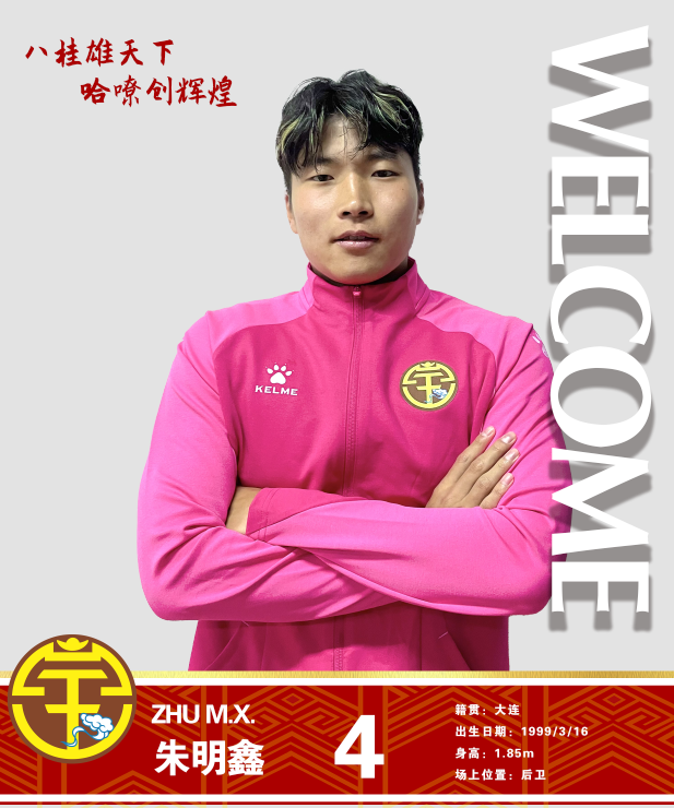 朱明鑫,1999年3月16日出生于大连,身高185cm,司职中卫、中锋。上赛季朱明鑫从中超长春亚泰租借到广西平果哈嘹效力。效力广西平果哈嘹期间,朱明鑫中后卫前锋无缝切换,共出战22场比赛,打进2球,还有多次助攻。