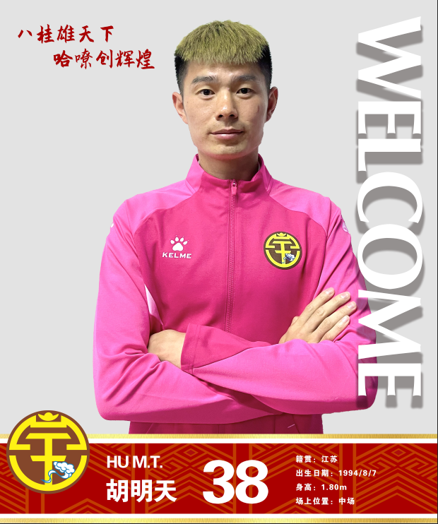 胡明天,1994年8月7日出生于江苏,身高180cm,司职中场,曾效力于中超成都蓉城队、帮助球队冲超成功。上赛季中超出战2场,后租借到陕西长安竞技等队,帮助陕西拿到中甲前六的好成绩。