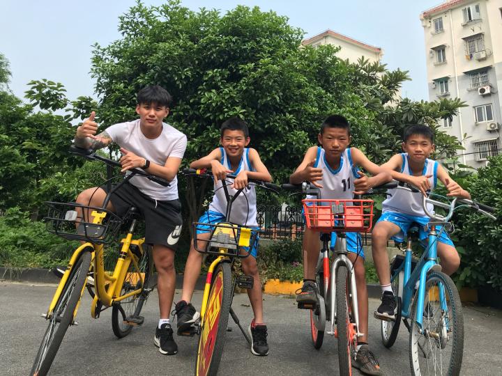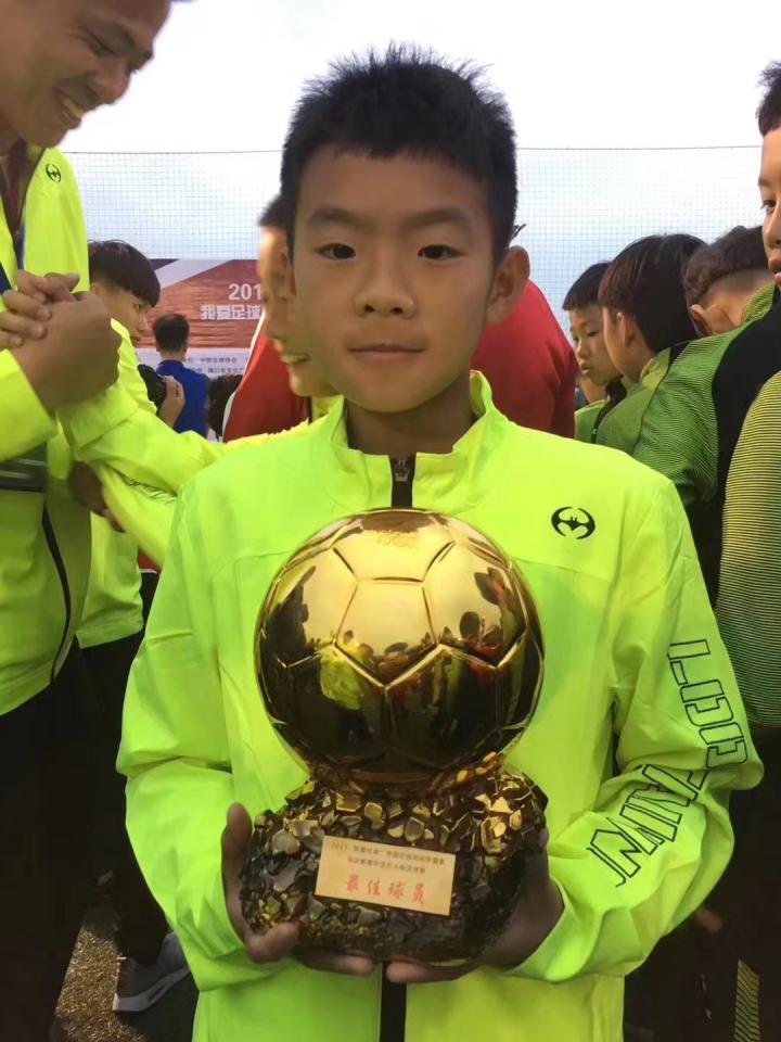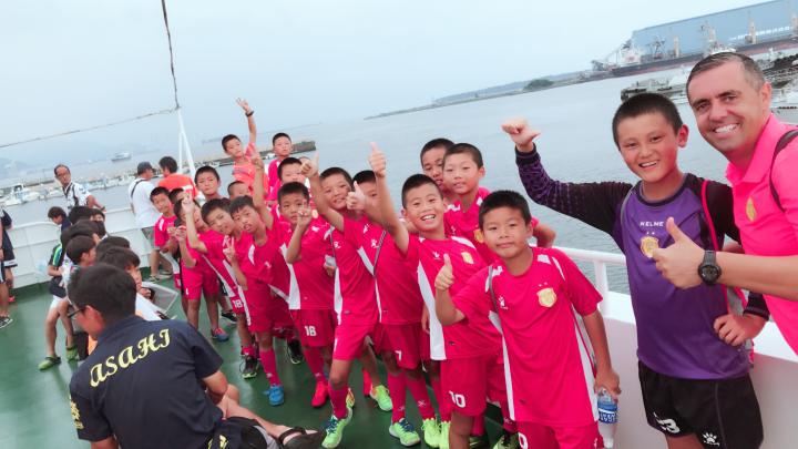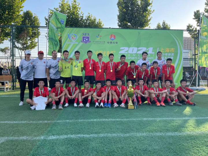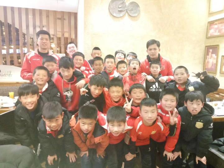 上海嘉定汇龙足球俱乐部董事长陆建军与年轻球员合影