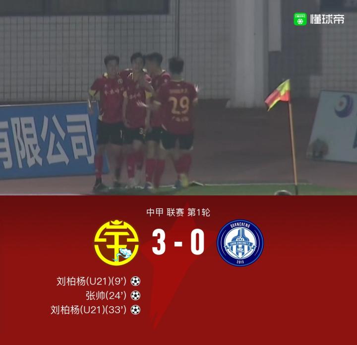 北京时间4月22日19:30,中甲第1轮,广西平果哈嘹主场对阵济南兴洲。上半场刘柏杨底线小角度劲射破门,随后朱明鑫头球击中横梁,张帅撞射入网,之后刘柏杨劲射球门近角完成双响。下半场王子豪倒钩破门因越位被吹。全场结束,广西3-0战胜济南迎开门红。