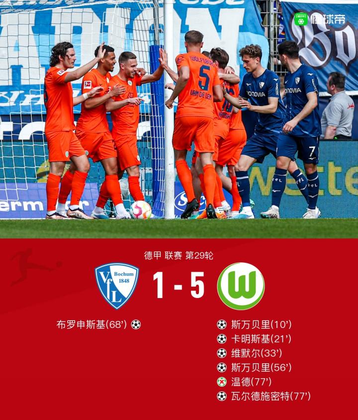扫描下载懂球帝首页>动态> 波鸿1-5狼堡四轮不胜,斯万贝里两射一传,维默尔传射建功