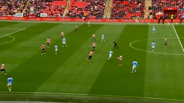 于是在上半场末段,谢菲联在定位球防守中鲁莽行事,送出点球,曼城借此得以开分: