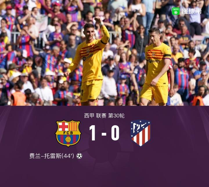 北京时间4月23日22:15,西甲第30轮迎来一场强强对话,巴塞罗那坐镇主场Spotify诺坎普球场迎战马德里竞技,本场主裁判为何塞-桑切斯。上半场,格列兹曼开场推射击中横梁,拉菲尼亚尾声阶段助攻费兰-托雷斯贴地斩破门。下半场,拉菲尼亚撞射空门被没收,莱万多夫斯基单刀贪功且没打进。最终,巴萨主场1-0赛季双杀马竞,并终结对方联赛六连胜。