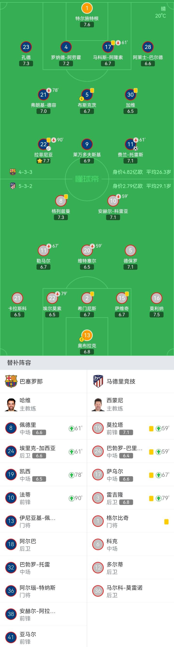 巴塞罗那首发:1-特尔施特根、28-阿莱士-巴尔德、17-马科斯-阿隆索(61'24-埃里克-加西亚)、4-罗纳德-阿劳霍、23-孔德、5-布斯克茨、21-弗朗基-德容(78'19-凯西)、30-加维、11-费兰-托雷斯(61'8-佩德里)、22-拉菲尼亚(90+3'10-法蒂)、9-莱万多夫斯基