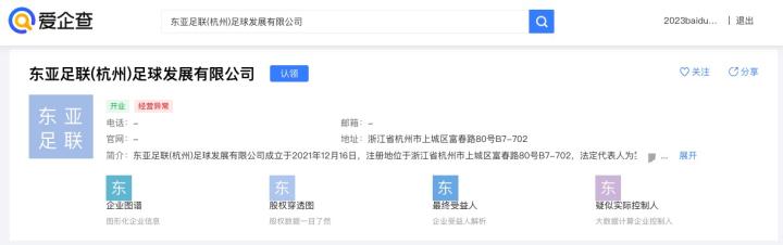 资料显示,东亚足联(杭州)足球发展有限公司是一个民营企业(个人出资10万元人民币成立),注册地址和杭州市体育事业发展中心的地址一致,都是杭州市上城区富春路80号。