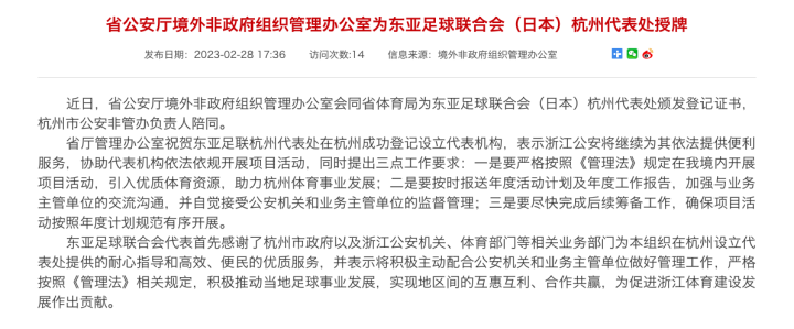 省公安厅境外非政府组织管理办公室为东亚足球联合会(日本)杭州代表处授牌http://gat.zj.gov.cn/art/2023/2/28/art_1229008267_59089086.html