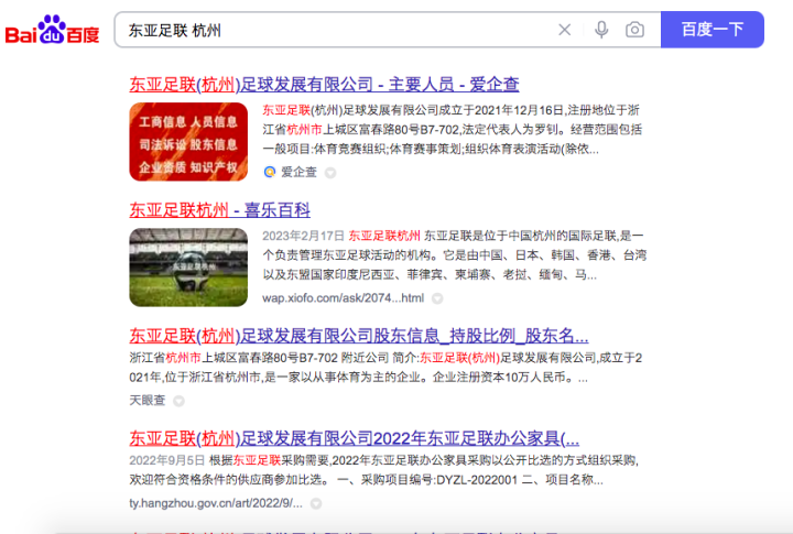 为了寻找落地杭州的东亚足联秘书处,队长在百度上搜索“东亚足联+杭州”,得到了如下结果: