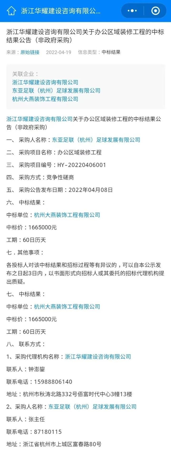 搜索中出现的东亚足联(杭州)有限公司相关的招标公告等,还是相当有意思的。比如,东亚足联(杭州)足球发展有限公司价值166.5万的装修工程招标结果: