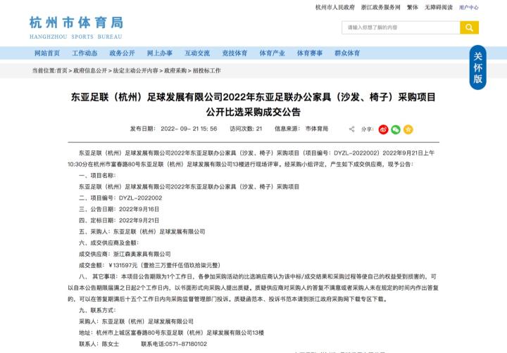 东亚足联(杭州)足球发展有限公司2022年东亚足联办公家具(沙发、椅子)采购项目公开比选采购成交公告http://ty.hangzhou.gov.cn/art/2022/9/21/art_1229292744_4088641.html