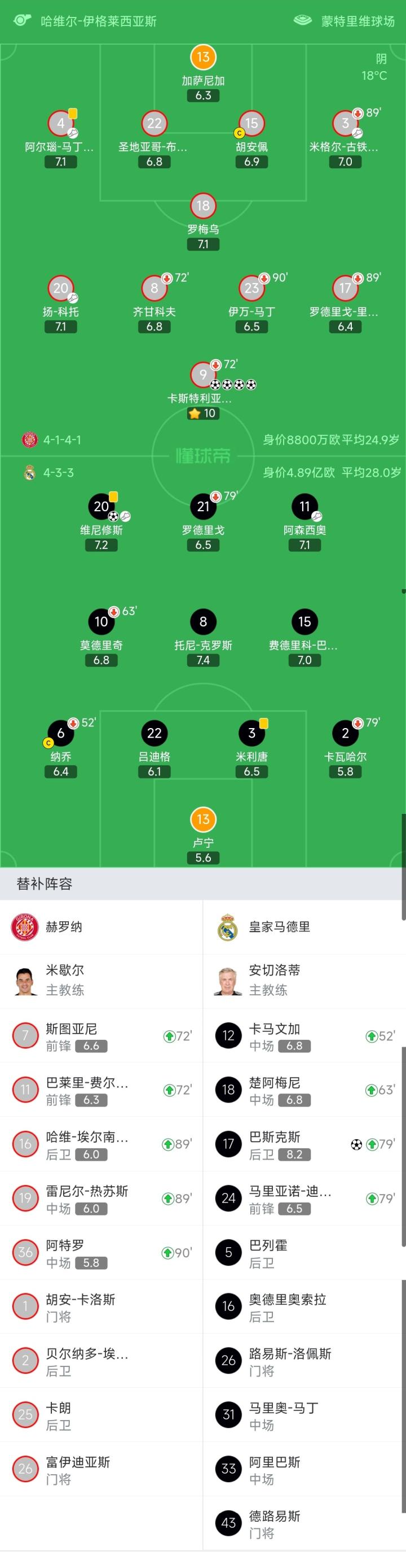 皇马首发:13-卢宁、6-纳乔(52′12-卡马文加)、22-吕迪格、3-米利唐、2-卡瓦哈尔(79′17-巴斯克斯)、8-克罗斯、10-莫德里奇(65′18-楚阿梅尼)、15-巴尔韦德、11-阿森西奥、21-罗德里戈(79′24-马里亚诺-迪亚斯)、20-维尼修斯