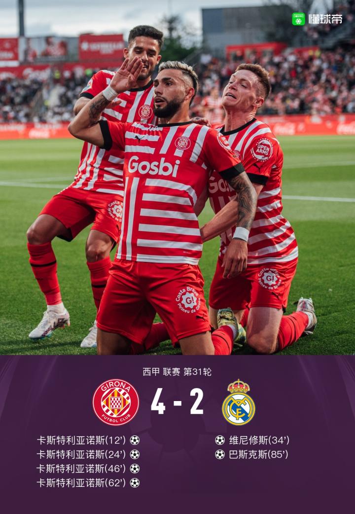 第62分钟,卡斯特利亚诺斯头球破门上演大四喜,赫罗纳4-1皇马!