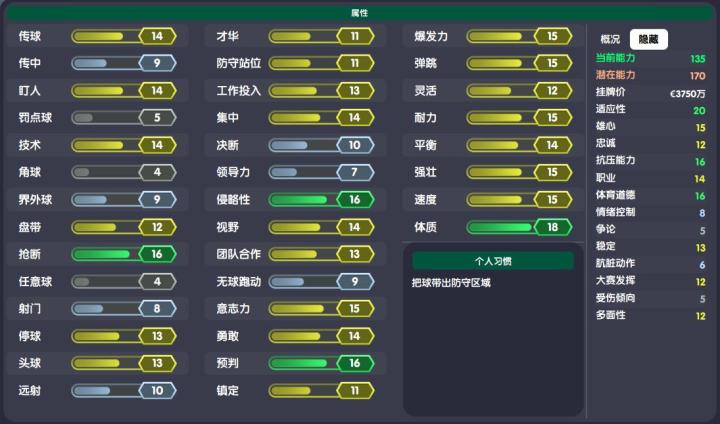 高亮:传球14,盯人14,技术14,抢断16,集中14,侵略性16,视野14,意志力15,勇敢14,预判16,爆发力15,弹跳15,耐力15,平衡14,强壮15,速度15,体质18,适应性20,雄心15,抗压能力16,职业14