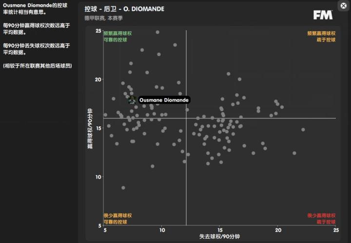迪奥曼德也具备不错的出球属性。他传球技术出色,再加之把球带出防守区域的习惯和不低的盘带属性,使他能够成为自后场的进攻发起者。这也让迪奥曼德更适合防线高压体系,与其让他落位在后场固守位置,不如让他前压并参与到出球体系中,以发挥他的速度和技术优势。