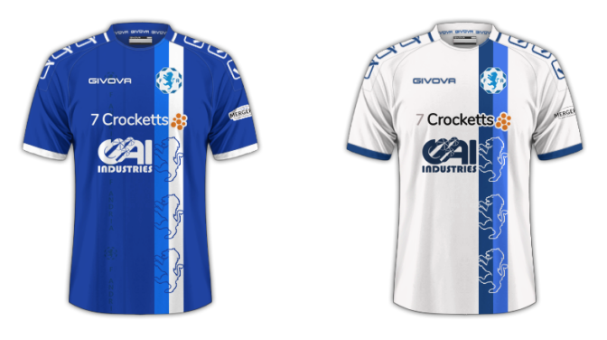 漂亮的主客场球衣。基于相同模板。队徽一侧有纵向的双色带,上面有三只队徽上的狮子。主客场均为深蓝-浅蓝-白搭配,只是侧重有所不同。为了给双色带让路,一个广告并非处在中心位置。