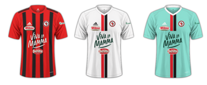 从Givova换成阿迪,球衣档次下降不少。主场纯粹是套用条纹模板,客场和第三球衣都是相同的基于模板设计,在球衣中部有红黑竖条。