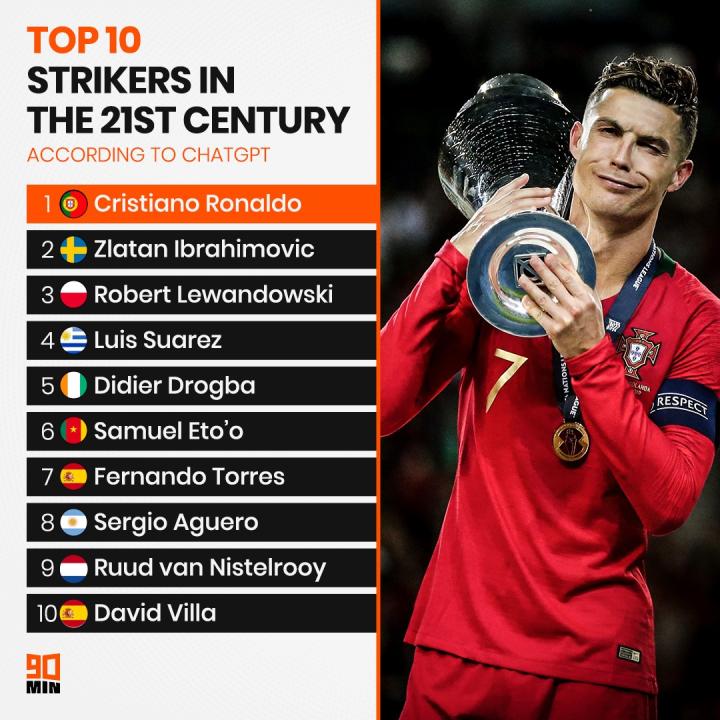 扫描下载懂球帝首页>动态> ChatGPT评21世纪十大中锋:C罗居首,伊布第二,莱万第三