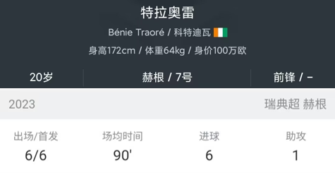前面我们说了,赫根是靠进攻夺得冠军。而打出现象级表现的杰里梅耶夫离队后,对球队进攻影响肯定是很大的。在转会窗,对位补进的是美职联华盛顿特区联的主力前锋奥拉·卡马拉,但从目前情况来看,卡马拉并没有受重用,6轮下来,3次登场都是替补,而且颗粒无收。站出来扛大旗的是刚满20岁,横空出世的小将特拉奥雷,目前特拉奥雷6场6球1助,输出稳定。赫根也继续保持着强势的状态,6轮5胜1负,位居积分榜次席,仅落后全胜的联赛霸主马尔默,而且赫根火力依旧稳定,场均近3球,总进球数17球,与马尔默并列联赛第一。