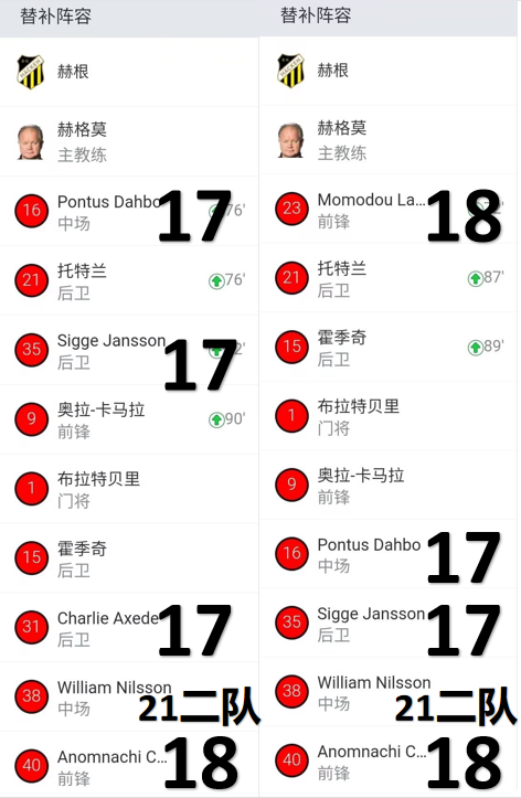 当然,这些伤员,是一直都有的,赫根也在新赛季逐渐习惯了没有这些球员,依旧能取得好成绩。但是,这周,是特殊的一周,球队面临着一周双赛。对于瑞典球队来说,一周双赛是什么概念?本身瑞超球员能够适应的强度就有限,瑞典杯也是在联赛没开打前打,球队一般也不会遭遇一周双赛的情况,同时瑞超外战也不行,如果要打国外杯赛,估计就得牺牲联赛成绩,就比如上赛季,和赫根争冠的尤尔加登,后面就被欧协联拖垮,伤兵满营,最终掉队。所以,瑞超球队,面对这种一周双赛的赛程,肯定或多或少要轮换,但现在,赫根有轮换空间吗?我们可以看下他们这几轮的替补席,全是17、18岁从梯队拉上来凑数的小孩。