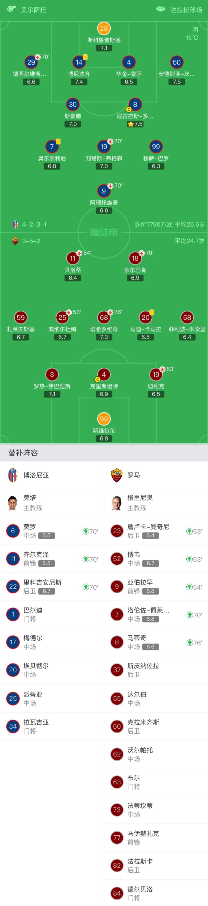 罗马首发:99-斯维拉尔、19-切利克(53'23-曼奇尼)、3-罗热-伊巴涅斯、4-克里斯坦特、59-扎莱夫斯基、20-卡马拉、58-菲利波-米索里、25-威纳尔杜姆(53'52-博韦)、68-塔希罗维奇(76'8-马蒂奇)、18-索尔巴肯(70'7-佩莱格里尼)、11-贝洛蒂(54'9-亚伯拉罕)
