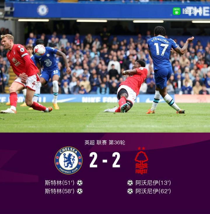 北京时间5月13日22:00,英超第36轮继续进行,切尔西坐镇主场斯坦福桥球场迎战诺丁汉森林,本场主裁判为保罗-蒂尔尼。上半场,阿沃尼伊抓住爱德华-门迪出击失误头槌破门,斯特林失良机,科瓦契奇伤退。下半场,斯特林连下两城上演梅开二度助蓝军逆转,阿沃尼伊扳平比分也完成双响。最终,切尔西主场2-2战平诺丁汉森林。