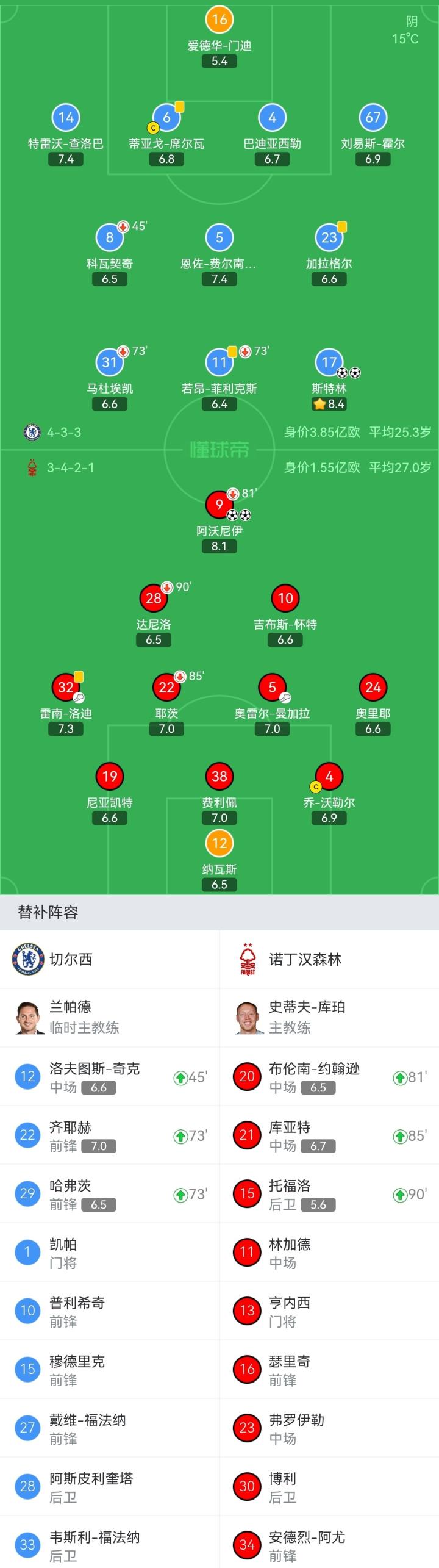 诺丁汉森林首发:12-纳瓦斯、19-尼亚凯特、38-费利佩、4-乔-沃勒尔、32-雷南-洛迪、24-奥里耶、28-达尼洛(90+1'15-托福洛)、5-奥雷尔-曼加拉、22-耶茨(85'21-库亚特)、10-吉布斯-怀特、9-阿沃尼伊(81'20-布伦南-约翰逊)