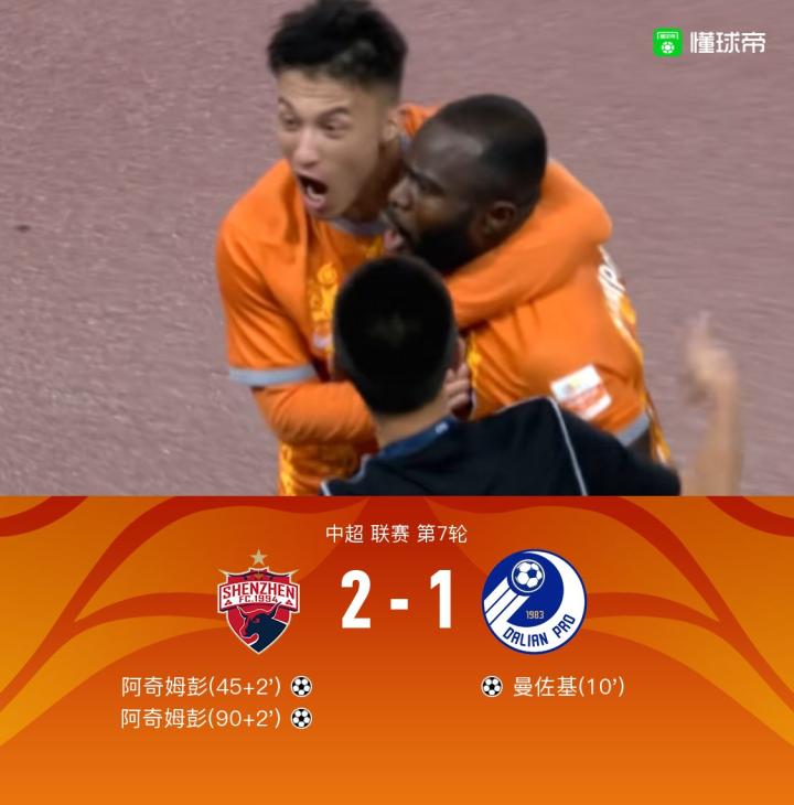 第45+2分钟,张远将球顶向门前,阿奇姆彭包抄推射破门,深圳1-1大连!