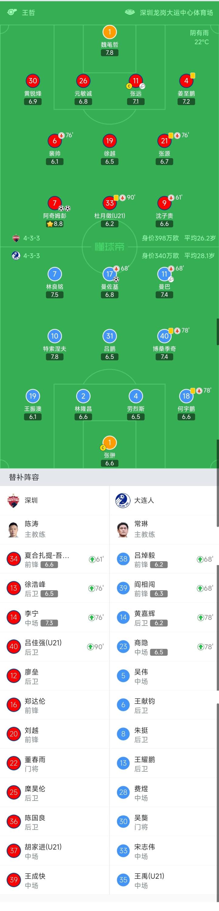 深圳首发:1-魏黾哲、4-姜至鹏、26-元敏诚、6-裴帅(76′14-李宁)、11-张远、9-沈子贵(61′34-夏合扎提)、21-张源(76′13-徐浩峰)、30-黄锐烽、19-徐越、33-杜月徴(90+7′40-吕佳强)、7-阿奇姆彭