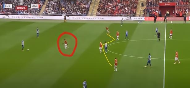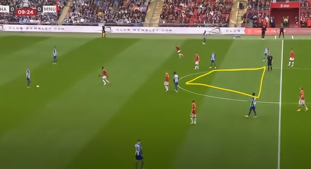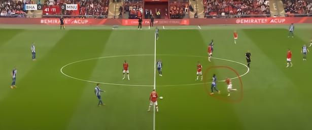 对于曼联和埃弗顿来说,边路前锋或边锋都挤在狭窄的位置,以阻挡布莱顿的两名前锋的传球,而布莱顿的两名前锋往往会深入到中场创造一个禁区。当这种情况发生时,这给中卫提出了一个难题;他会跟随前锋还是把他传给中场?如果是前者,就像卢克·肖对位丹尼·维尔贝克一样,他需要确保他的控球中场在他身后掩护,就像卡塞米罗在半决赛中做的一样。