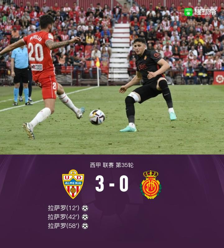 北京时间5月21日0:30,西甲第35轮,阿尔梅里亚主场对阵马略卡。上半场拉萨罗门前抓住机会破门,半场尾声阶段拉萨罗劲射破门完成双响。下半场路易斯-苏亚雷斯献助攻,拉萨罗破门上演帽子戏法,之后马略卡队打进一球,但越位进球无效。全场结束,阿尔梅里亚3-0马略卡。
