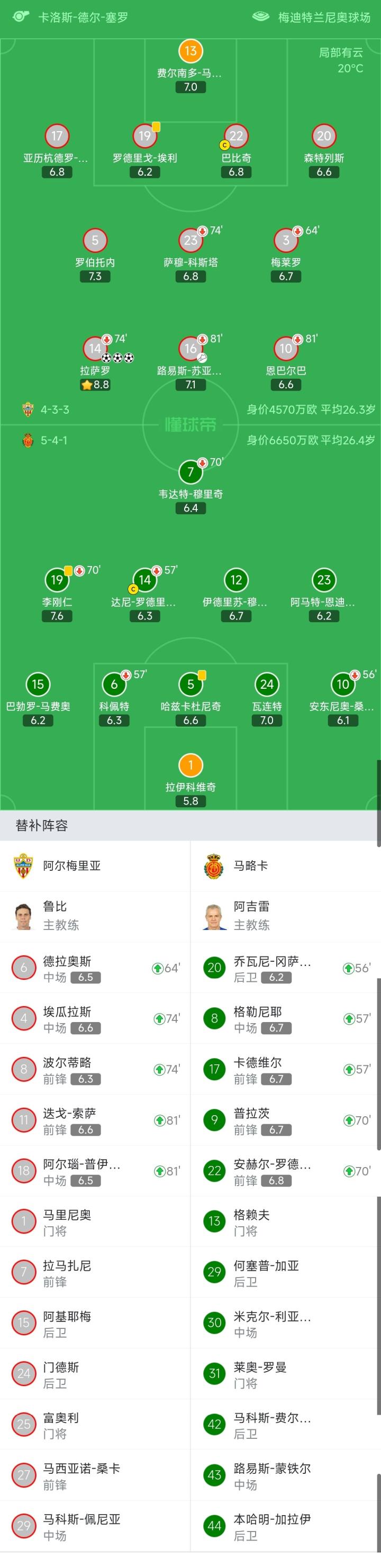 阿尔梅里亚首发:13-费尔南多-马丁内斯、20-森特列斯、19-罗德里戈-埃利、22-罗德里戈-埃利、17-亚历杭德罗-波索、5-罗伯托内、3-梅莱罗(64′6-德拉奥斯)、23-萨穆-科斯塔(74′4-埃瓜拉斯)、16-路易斯-苏亚雷斯(81′11-迭戈-索萨)、10-恩巴尔巴(81′18-阿尔瑙-普伊赫马尔)、14-拉萨罗(74′8-波尔蒂略)