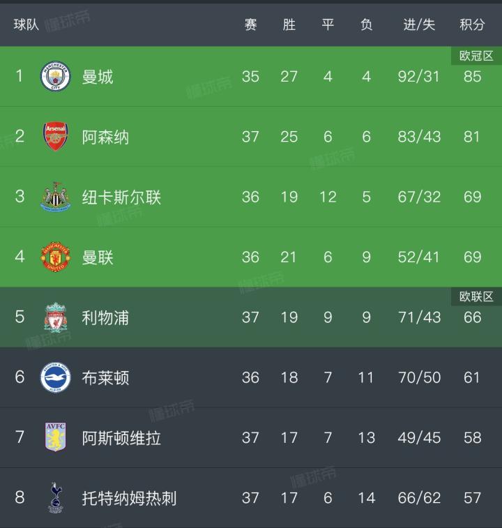 36轮61分,周中还有一轮和曼城的32轮补赛