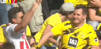 得到拜仁被扳平的消息!看台上科隆球迷与多特球迷相拥庆祝!