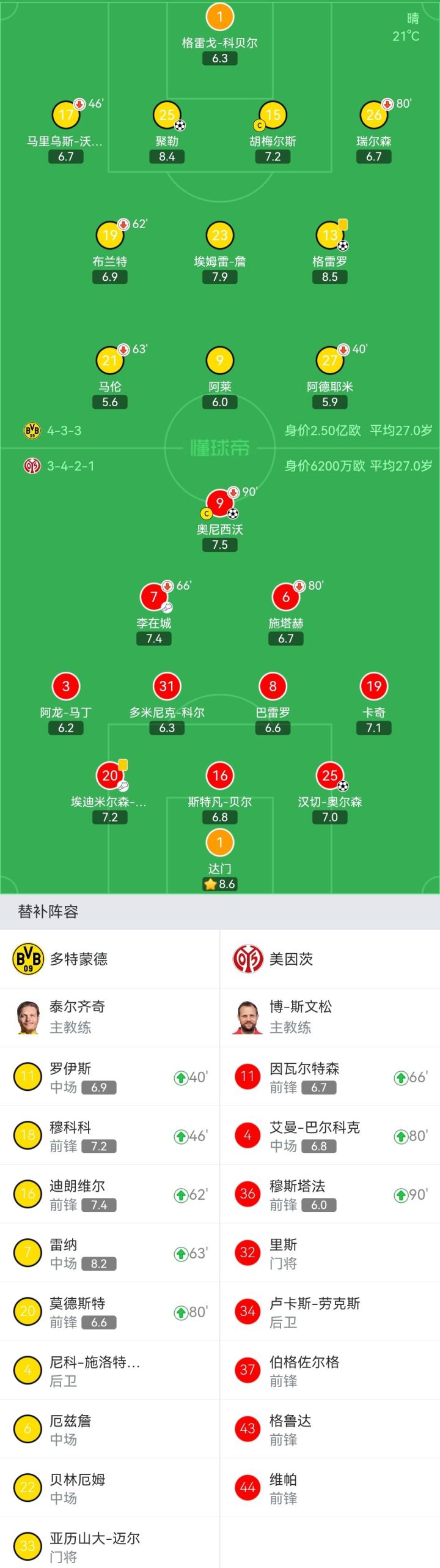 多特蒙德首发:1-格雷戈-科贝尔、26-赖尔森(80'20-莫德斯特)、15-胡梅尔斯、25-聚勒、13-格雷罗、23-埃姆雷-詹、17-马里乌斯-沃尔夫(46'18-穆科科)、19-布兰特(62'16-迪朗维尔)、21-马伦(62'7-雷纳)、27-阿德耶米(40'11-罗伊斯)、9-阿莱