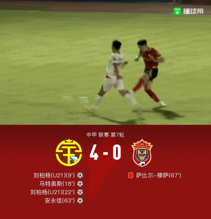 北京时间5月27日19:30,中甲第7轮比赛,广西平果哈嘹对阵辽宁沈阳城市。上半场,刘柏杨打破僵局并随后完成梅开二度,马特奥斯任意球破门;下半场,安永佳建功,穆萨染红,广西4-0大胜十人辽宁沈阳城市。